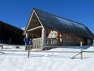 Встали пораньше, чтобы перекусив, побыстрее покинуть пределы турбазы и вообще Ворохты. На дворе заметно добавилось снега, но держится почти нулевая температура. А вокруг – потрясающая панорама горных склонов с припорошенными свежим снегом хвойными лесами. Рядом с турбазой расположен старый, еще советский горнолыжный спуск с трамплином. Трасса, по слухам, действующая и даже имеется бугельный подъёмник.